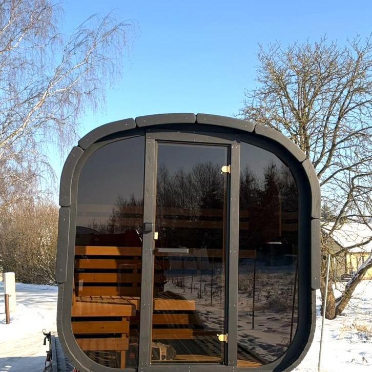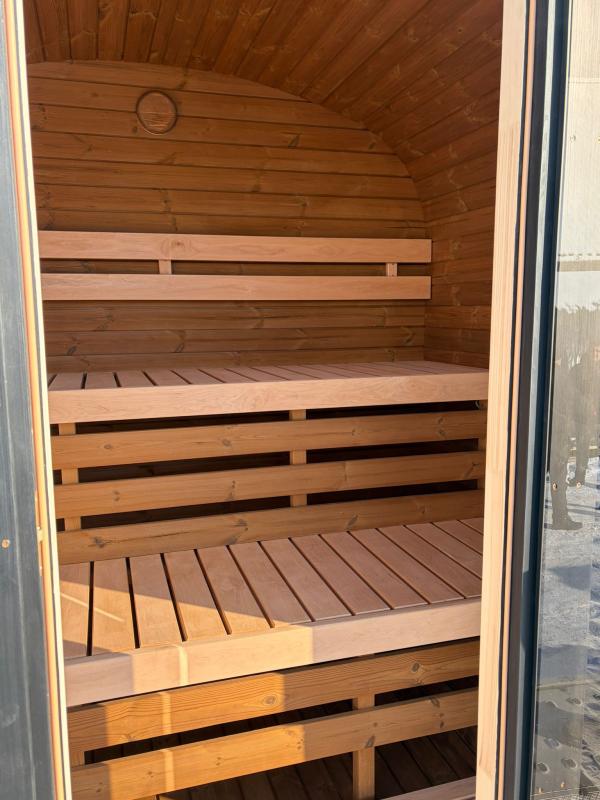 Breite und Höhe der Sauna 220 cm, Tiefe der Sauna 150 - 200 cm.