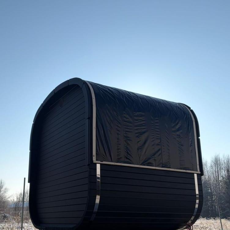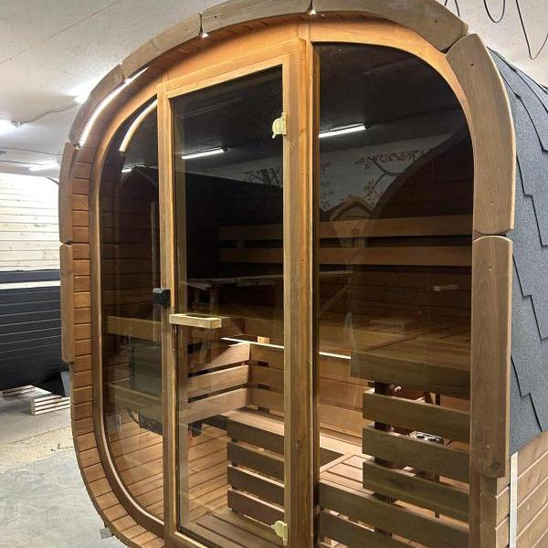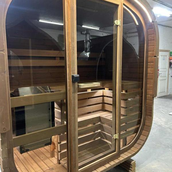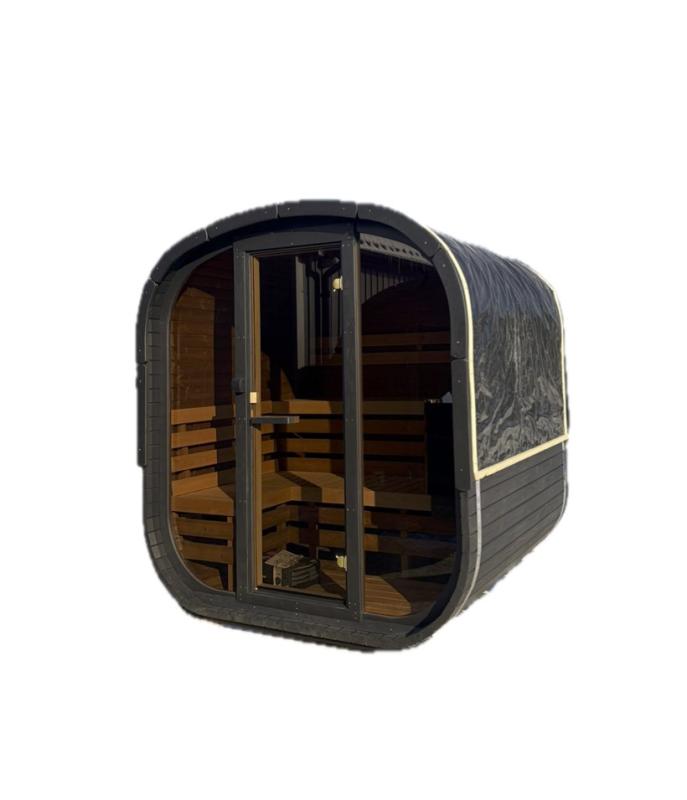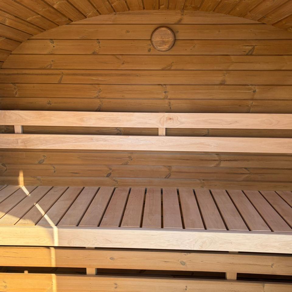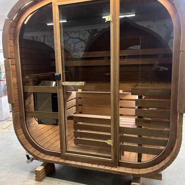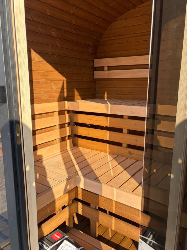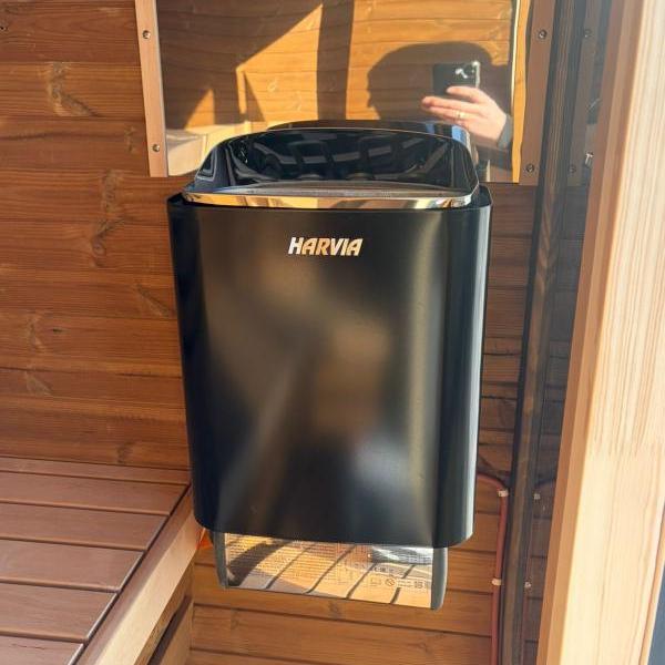 Der 6 kW elektrische Heizofen und die Frontverglasung der Sauna sind bereits im Preis der Sauna enthalten!